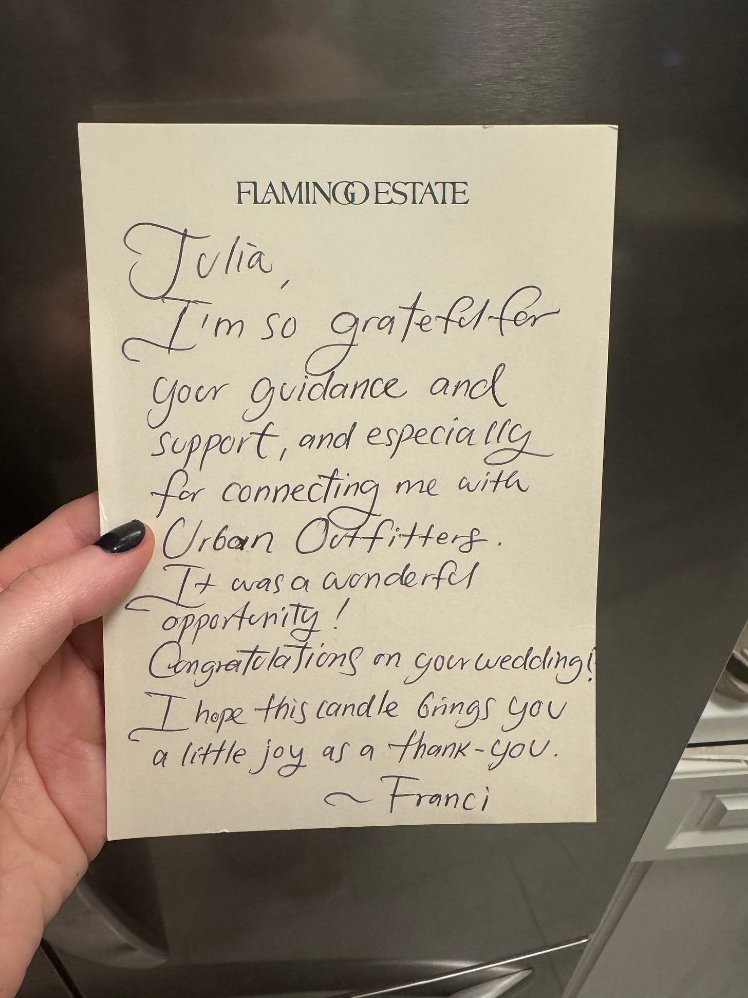 Franci (an amazing graphic designer who has helped me with many design projects, including the VARSITY READER logo!) sent me this sweet note before my wedding. Flamingo Estate definitely has some great calligraphers on hand—isn’t this so much more personal than a typed gift note? And the candle she picked out for me was equally great!