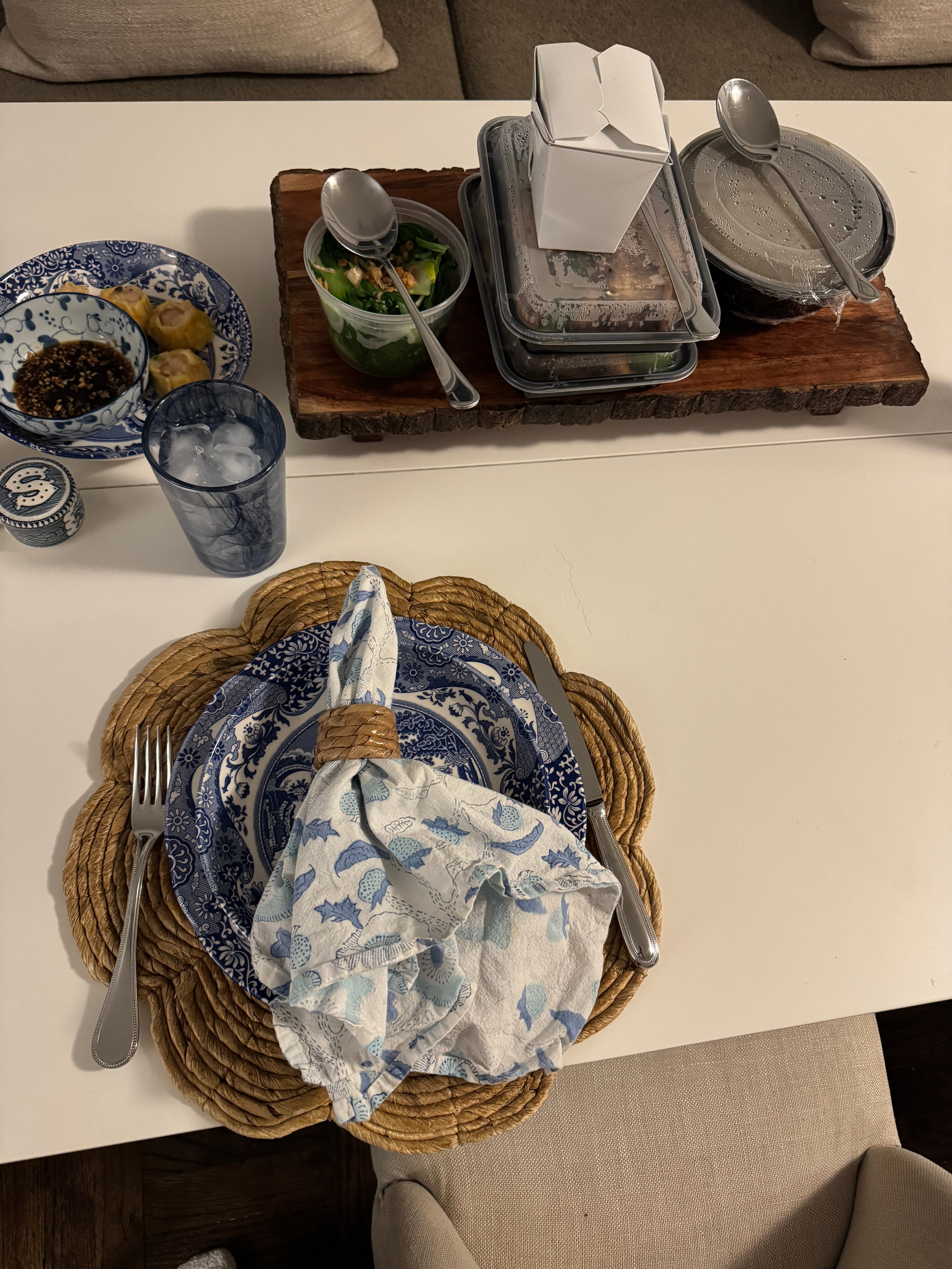 Here’s to having friends over more in 2026! Two of my friends spontaneously came over for dinner the other night and it was so fun. We got takeout, so I didn’t pull out my serving bowls and saved the touch of fancy for the place settings.